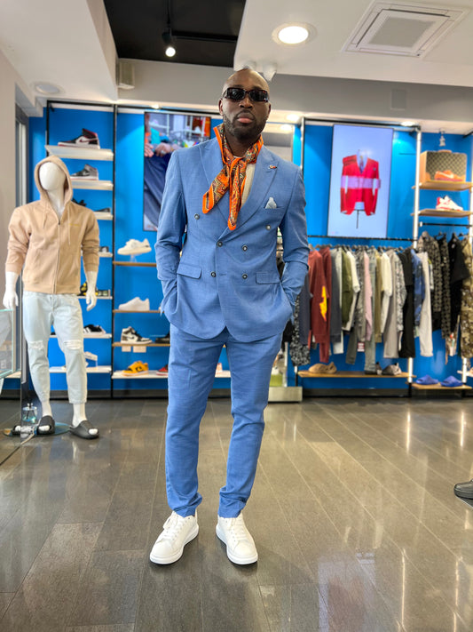 ABITO DOPPIO PETTO BLUE GESSATO SLIM FIT IN LANA ECOSOSTENIBILE